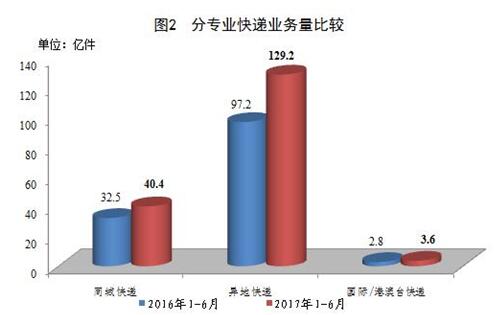 上半年,同城、异地、国际/港澳台快递业务量分别占全部快递业务量的23.3%、74.6%和2.1%;业务收入分别占全部快递收入的14.3%、51%和11%。与去年同期相比,同城快递业务量的比重下降1.2个百分点,异地快递业务量的比重上升1.2个百分点,国际/港澳台业务量的比重基本持平。