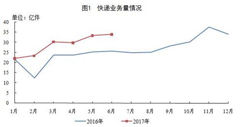 6月份,全国快递服务企业业务量完成34亿件,同比增长32.1%;业务收入完成419.9亿元,同比增长29.6%。
